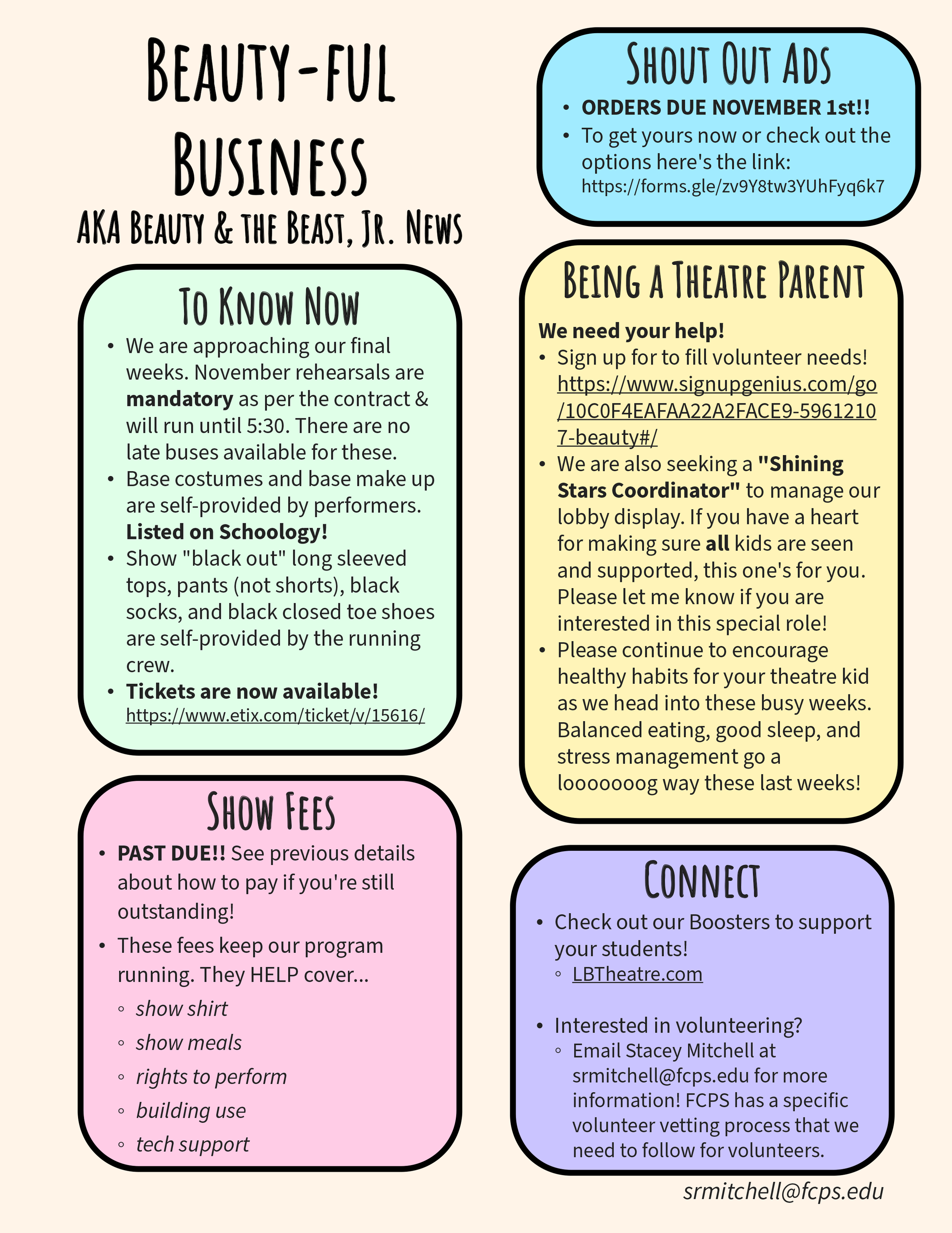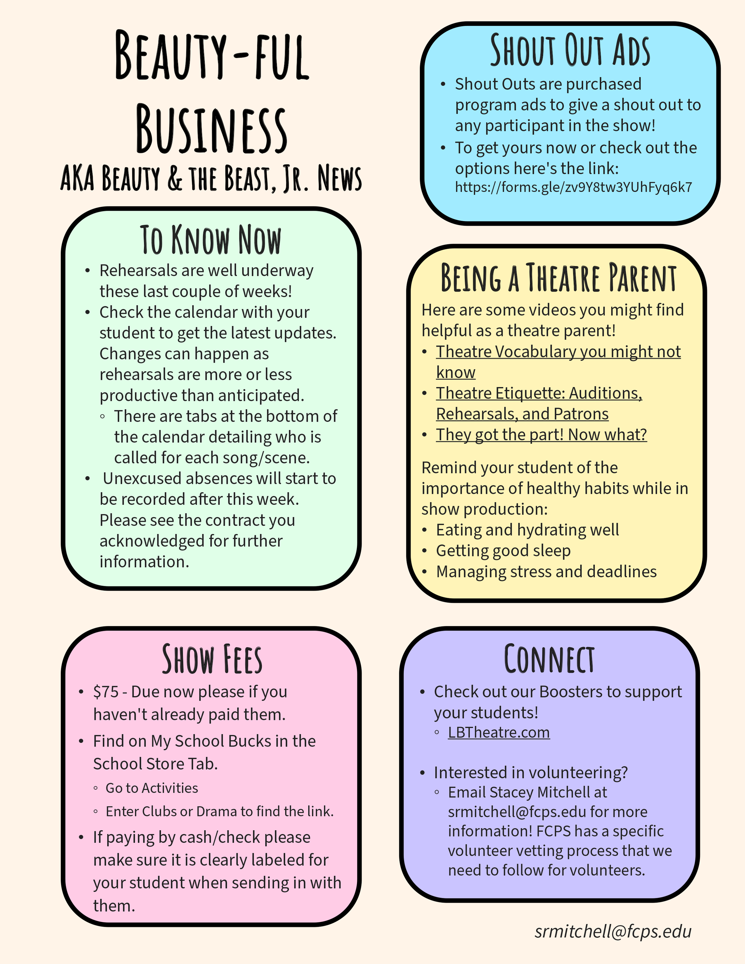 Beauty and the Beast is right around the corner and we will need your help! Please sign up below to donate items for concessions or fill a volunteer shift. If your student is involved in Beauty and the Beast, we would be very grateful if you would fill at least one Show Support spot.